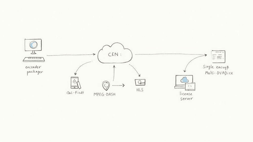 Think of DRM for video not as a separate add-on, but as a critical thread woven directly into your video delivery pipeline. It has to work hand-in-glove with the technologies you already use for encoding, packaging, and streaming. This is where the abstract ideas of encryption and licensing meet the real-world challenge of getting a secure, high-quality stream to any screen.